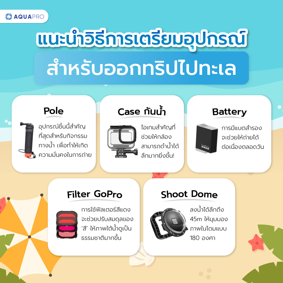 หัวข้อนี้ AquaPro จะมาแนะนำ วิธีการเตรียมอุปกรณ์เสริม GoPro HERO12 Black สำหรับออกทริปไปทะเล เพื่อให้ได้ภาพสวยและใช้งานได้อย่างเต็มประสิทธิภาพ ซึ่งประกอบไปด้วย