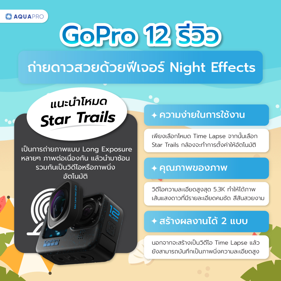 นอกจากถ่ายรูปใต้น้ำแล้ว GoPro 12 ยังมีฟีเจอร์ Night Effects ที่ทำให้การถ่ายภาพกลางคืนหรือการถ่ายดาวสวยๆ เป็นเรื่องที่ง่าย สำหรับใครที่อยากเก็บภาพความประทับใจตอนกลางคืน แนะนำฟีเจอร์ Night Effects ของ GoPro12 โหมด Star Trails เป็นการถ่ายภาพแบบ Long Exposure หลายๆ ภาพต่อเนื่องกัน แล้วนำมาซ้อนรวมกันเป็นวิดีโอหรือภาพนิ่งอัตโนมัติ